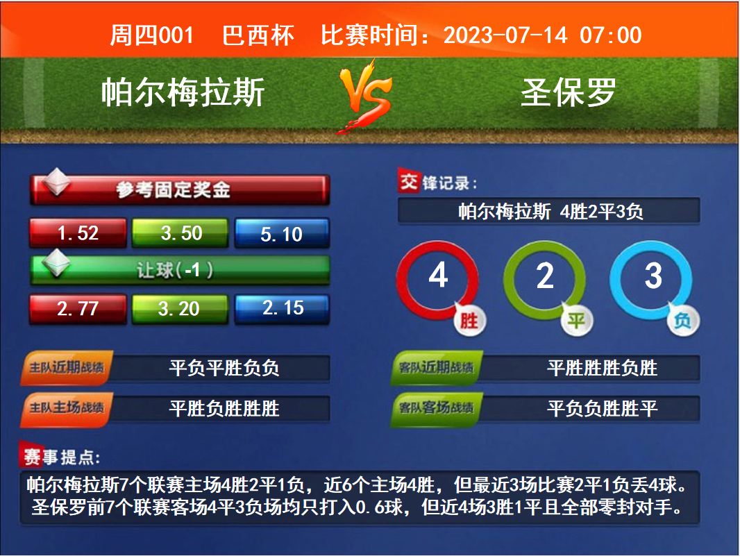 周四競(jìng)彩足球強(qiáng)檔:帕爾梅背水一戰(zhàn) 圣保羅防守效率高