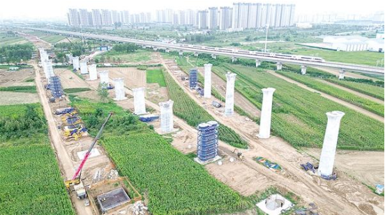 9月21日上午,在平漯周高鐵接入高鐵周口東站的施工現(xiàn)場(chǎng),中鐵十局的工人正緊張施工。據(jù)了解,該項(xiàng)目將通過新建三條軌道接入高鐵周口東站,屆時(shí),高鐵周口東站將升級(jí)成為四條軌道并行的高鐵樞紐站。