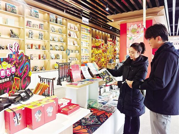 12月18日,在太昊伏羲陵文化旅游區(qū)旅游產(chǎn)品展廳,游客在欣賞非遺手工產(chǎn)品。近年來,太昊伏羲始祖旅游區(qū)運營管理有限公司為豐富游客體驗,聚焦非遺手工、潮玩手辦等主題,開發(fā)了近百個旅游新產(chǎn)品,以滿足游客多元化需求。