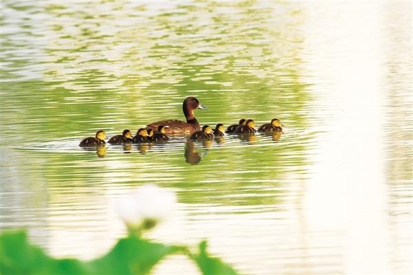 6月24日,世界極度瀕危物種、國(guó)家一級(jí)保護(hù)野生動(dòng)物青頭潛鴨現(xiàn)身淮陽(yáng)龍湖。當(dāng)日,一只青頭潛鴨帶著10只可愛(ài)的“鴨寶寶”在湖中緩緩游弋。有關(guān)方面人士告訴記者,種種跡象可以證明:青頭潛鴨已在淮陽(yáng)龍湖國(guó)家濕地公園安家落戶、繁衍生息。
