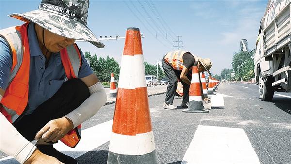連日來,西華縣華興大道、中原路升級改造項目建設如火如荼。項目完工后,將進一步提升道路通行能力,助力城市“顏值”與品質(zhì)雙升級。圖為工人在施工現(xiàn)場固定反光錐。
