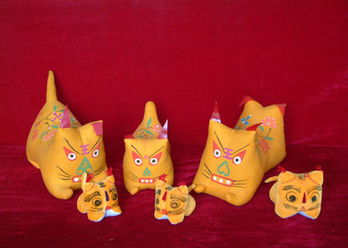 在淮陽古廟會上,隨處可以看到琳瑯滿目的布老虎,有單頭虎、雙頭虎、直臥虎、側臥虎、玩具虎、枕頭虎等,形態(tài)各異,大小不一。這些老虎不是深山老林中那種兇猛的野獸,而是裝飾化、人格化了的布玩……[詳細]