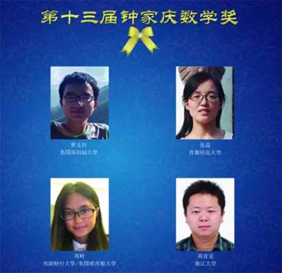中國(guó)數(shù)學(xué)會(huì)21日揭曉了第十三屆華羅庚數(shù)學(xué)獎(jiǎng)、第十六屆陳省身數(shù)學(xué)獎(jiǎng)和第十三屆鐘家慶數(shù)學(xué)獎(jiǎng)的獲獎(jiǎng)名單。今年獲得鐘家慶數(shù)學(xué)獎(jiǎng)的分別是美國(guó)斯坦福大學(xué)的樊玉偉(來(lái)自河南周口)、首都師范大學(xué)的張蕊、西南財(cái)經(jīng)大學(xué)和美國(guó)密西根大學(xué)的周嶺、浙江大學(xué)的周青龍等4名博士生?!?a href="http://www.ynckhj.com/content/2017-10/23/content_581562.htm" target="_blank" >[詳細(xì)]