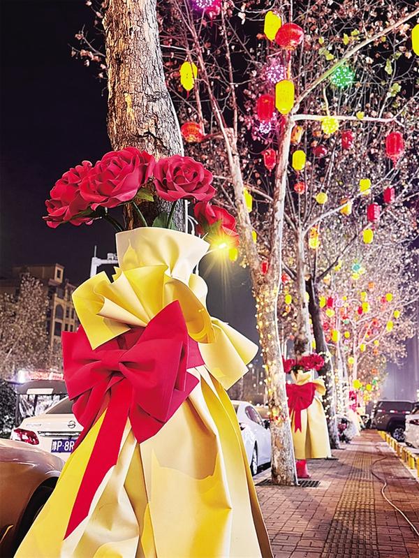 1月15日,記者在慶豐中路(勝利街至西六路段)看到,經(jīng)過(guò)精心布置,行道樹(shù)搖身一變成為巨型“玫瑰花束”,仿佛是精心準(zhǔn)備的城市禮物。