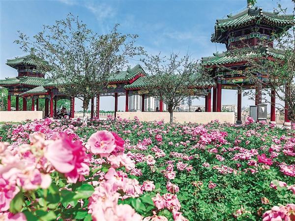 中心城區(qū)八一大道與濱河南路交叉口西側(cè)游園內(nèi)月季花盛開。近日,在中心城區(qū)多條提升改造的道路中間及兩側(cè)的綠化帶內(nèi),“棒棒糖”月季花和地栽刺玫花如約盛開。