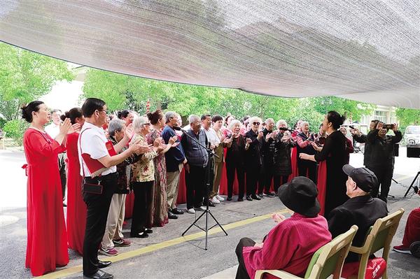 4月27日,周口市退伍軍人合唱團(tuán)到川匯區(qū)太昊路老年護(hù)理院慰問(wèn)演出。合唱團(tuán)成員與老人一起演唱《我的祖國(guó)》。
