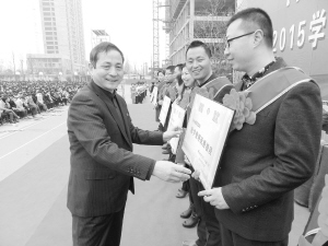 3月8日上午,淮陽一高萬余名師生在學校操場隆重舉行新學期表彰大會。大會回顧了2014~2015學年第一學期的各項工作,對感動校園學生、優(yōu)秀班主任、優(yōu)秀員工、優(yōu)質課教師等24個項目近500人次進行了表彰?;搓柨h有關領導及淮陽一高全體師生參加了本次表彰大會。圖為王業(yè)生校長為獲獎人員頒發(fā)獎狀。(豆紀鋒 攝)