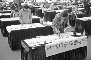 2015“金臺杯”世界大學(xué)生書法大賽復(fù)賽在京舉行 4月12日,參賽選手在現(xiàn)場書寫作品。當(dāng)日,由中國藝術(shù)教育促進會主辦的2015“金臺杯”世界大學(xué)生書法大賽復(fù)賽在北京舉行。據(jù)了解,本次大賽初賽已于2014年11月完成,復(fù)賽按中國和外國兩大組分別進行評選,最終在百余位參賽的選手中選出一等獎、二等獎、三等獎和優(yōu)秀獎。 新華社發(fā)