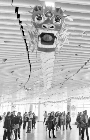 4月11日,游人在園博園參觀開幕式上的風(fēng)箏展覽。當(dāng)日,2015年北京國際風(fēng)箏節(jié)在北京豐臺區(qū)園博園開幕,來自廣東、山東等國內(nèi)20支代表隊(duì)和美國、英國等22支國外代表隊(duì)的120位風(fēng)箏愛好者參加風(fēng)箏節(jié)。新華社發(fā)
