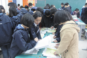 該校將課堂名字定為“求真大課堂”,以“真”字作為學(xué)校一切教育教學(xué)和管理的衡量標(biāo)準(zhǔn)。朱貴華說,求真就是要真教、真學(xué)、真嚴(yán)、真愛、真實、真會。為提高課堂教學(xué)效果,該??偨Y(jié)出一套獨特的課堂教學(xué)方法——“七音和鳴”。分管教學(xué)工作的副校長徐其運用“1234567”,即哆來咪發(fā)唆拉西”來詮釋“七音和鳴”法。“1”就是一個學(xué)習(xí)目標(biāo);“2”就是提前兩分鐘進(jìn)班,布置2個任務(wù)(出示目標(biāo)、檢查學(xué)情);“3”就是準(zhǔn)備3個本子,即學(xué)情檢效本、跟蹤本、糾錯本;“4”是4個維度考評,即高速度、準(zhǔn)確度、干凈度、參與度;“5”是5個跟蹤,即節(jié)跟蹤、日跟蹤、周跟蹤、月跟蹤、學(xué)期跟蹤,堅持“抓緊跟蹤不放松、我在文昌必成功”的教育信念;“6”是6個環(huán)節(jié),即激情導(dǎo)入、自研自探、合作探究、展示質(zhì)疑、師生點評、當(dāng)堂檢測;“7”是7個評價,即教師的教案、學(xué)生的學(xué)案、練案、觀課記錄的每周業(yè)務(wù)評價及對學(xué)生的即時性、激勵性、長效性評價。