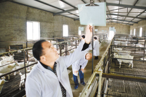 孫振偉原是當?shù)刂那嗄昶髽I(yè)家,2008年初被西關(guān)村居民高票選舉為村黨支部書記,憑著對家鄉(xiāng)的強烈責任感和保護槐山羊特色品種的使命感,孫振偉帶領(lǐng)西關(guān)村立足本村作為槐山羊傳統(tǒng)養(yǎng)殖區(qū)的優(yōu)勢,于2010年成立沈丘縣槐山羊養(yǎng)殖發(fā)展有限公司,在省畜牧展交易會上,與鄭州鄭源公司合作,共同簽約了投資6000萬元建設(shè)槐山羊原種保護、繁育、深加工項目。同時與華中農(nóng)大建立技術(shù)合作關(guān)系,投資800萬元建成“槐山羊原種保護和繁育中心”,規(guī)劃設(shè)計了化驗室、消毒室、提純復壯室、品種基因室等配套規(guī)范設(shè)施,不僅為國家級優(yōu)良品種槐山羊的保種提純工作提供了科研平臺和寶貴數(shù)據(jù)庫,“槐山羊提純復壯良種繁育技術(shù)研究與應用”成果還獲得2013年度周口市科技進步一等獎。經(jīng)過提純復壯,目前中心存欄特征明顯的槐山羊母羊860只、種公羊36只,在此基礎(chǔ)上,計劃建成占地100畝的槐山羊養(yǎng)殖小區(qū),槐山羊板皮、肉制品等深加工項目都已經(jīng)開始實施。 “這些是經(jīng)過第五輪提純復壯繁育的槐山羊,目前可以說是最純種的槐山羊了。”孫振偉指著一批剛出生的小羊向我們介紹。