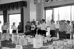 羅文閣在商務(wù)中心區(qū)規(guī)劃沙盤前聽取項目進(jìn)展情況匯報。丁宇濤 攝
