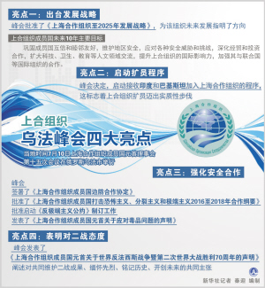 烏法,見證金磚國家新開發(fā)銀行籌備工作全面展開,應急儲備安排正式啟動;見證上合組織成立14年來首次擴員,印度和巴基斯坦加入上合組織的程序啟動,白俄羅斯成為觀察員國,阿塞拜疆、亞美尼亞、柬埔寨、尼泊爾成為對話伙伴國……新興和發(fā)展中國家伙伴關系日益密切。