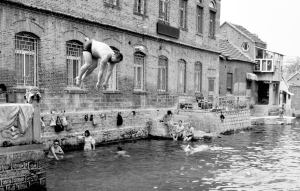 7月14日,一名濟南市民在濟南市王府池子跳水游泳。當(dāng)天,濟南市最高氣溫超過39攝氏度,為10年以來同期最高氣溫。