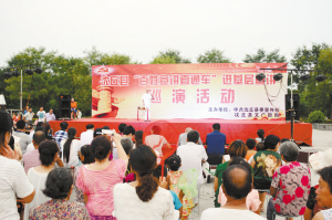 7月13日,沈丘縣“百姓宣講直通車”進(jìn)基層宣講首場演出在該縣中華槐園千字文廣場舉行,舞蹈、戲曲、小品、大鼓書等多樣化的藝術(shù)形式,為前來游玩休閑的市民獻(xiàn)上了一道豐厚的精神大餐,讓大家在娛樂之余,對黨的新理論新政策有了更多的了解。圖為節(jié)目演出現(xiàn)場。(邵永成 攝)